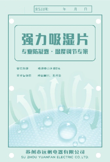 箱柜吸湿片是在合成橡胶中混合了高吸水性聚合物的无卤、环保吸湿片。根据材料的特性进行安装空间内的湿度调节作用,且可以反复利用,保证箱柜内无凝露现象发生,保障设备正常运行。与以往颗粒状、粉末状的吸湿产品不同,本品是由无纺布包裹起来的薄片,因此安装时不受环境的限制非常简单。特别适用于狭小空间,且无法提供电源的特殊环境内进行柜体除湿。